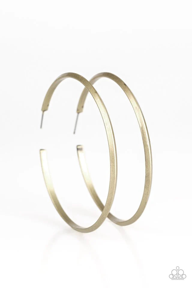 Brushed in an antiqued shimmer, a glistening brass bar curls into a sleek hoop for a classic look. Earring attaches to a standard post fitting. Hoop measures 2 1/2" in diameter. Sold as one pair of hoop earrings.