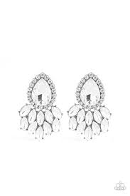 Glassy white marquise style rhinestones cascade from the bottom of a dramatically oversized white teardrop gem, coalescing into a regal frame. Earring attaches to a standard post fitting.
