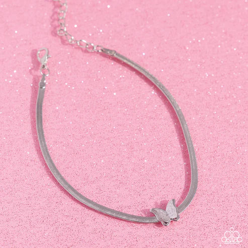 Featuring a lightly hammered texture, a dainty silver butterfly joins a sleek silver butterfly for a three-dimensional pendant that flutters atop a silver herringbone chain around the ankle for a whimsical finish. Features an adjustable clasp closure.