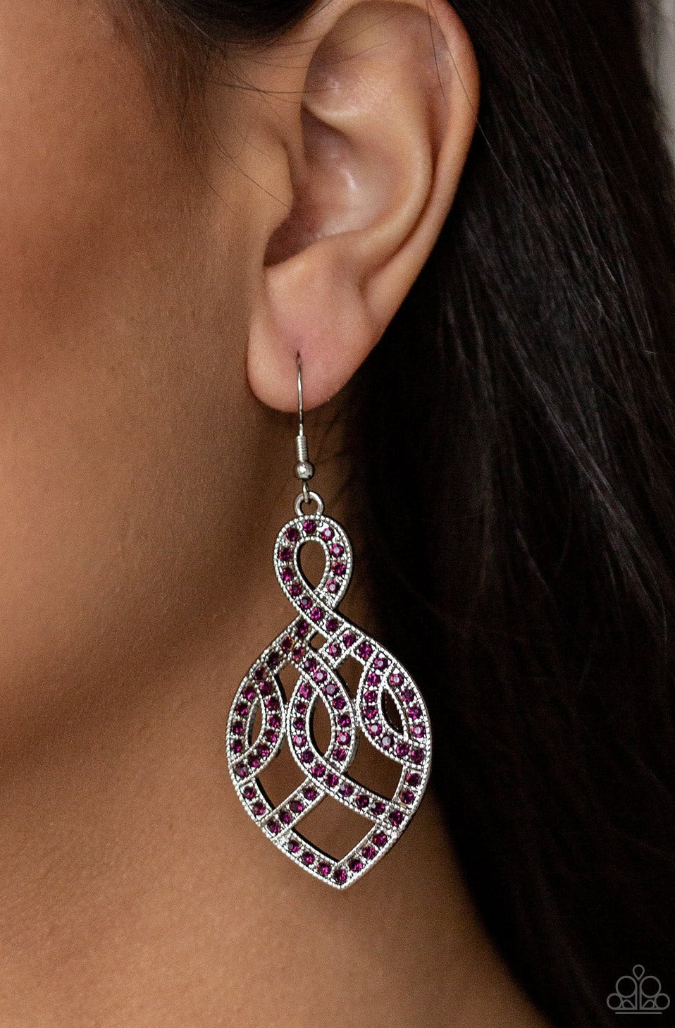 Encrusted in glittery purple rhinestones, ribbons of shimmery silver loop into an ornate frame for a refined flair. Earring attaches to a standard fishhook fitting.