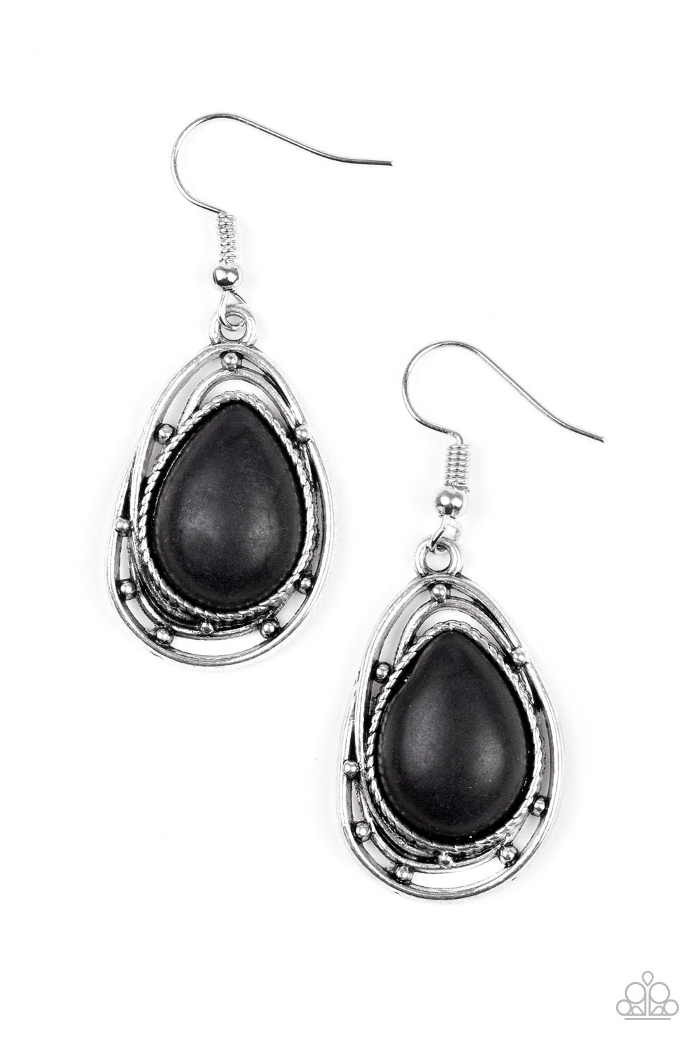 Chiseled into a tranquil teardrop, an earthy black stone is pressed into the center of a twisting silver frame for a handcrafted look. Earring attaches to a standard fishhook fitting.