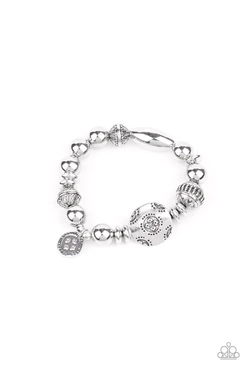 A mismatched collection of smooth and decorative silver beads are threaded along a stretchy band around the wrist. An ornate silver charm dangles from the center for an eye-catching finish.