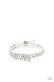 Featuring two oversized white rhinestone fittings, a glittery collection of white rhinestone encrusted silver frames are threaded along a silver wire around the wrist, creating a glamorous infinity wrap bracelet.