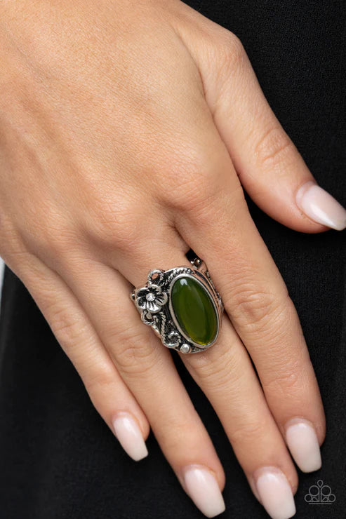 Dotted with a dainty white rhinestone center, a leafy floral frame climbs the side of a glassy green bead for an enchanted look. Features a stretchy band for a flexible fit.