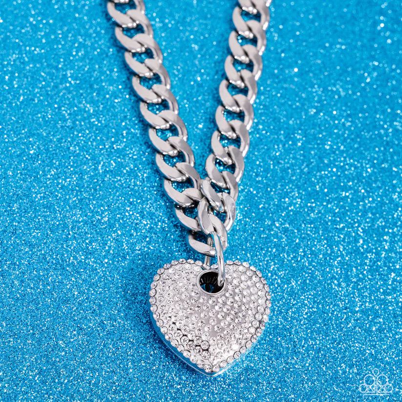 Featuring an intense white rhinestone embellishment, an oversized silver heart frame swings from the bottom of a thick silver curb chain for an edgy declaration. Features an adjustable clasp closure.