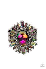 A large oil spill rhinestone sparkles inside a ring of dainty hematite rhinestones. Emerald cut oil spill and hematite rhinestones fan out from the dazzling center, exploding into a stellar centerpiece atop the finger. Features a stretchy band for a flexible fit. Due to its prismatic palette, color may vary.