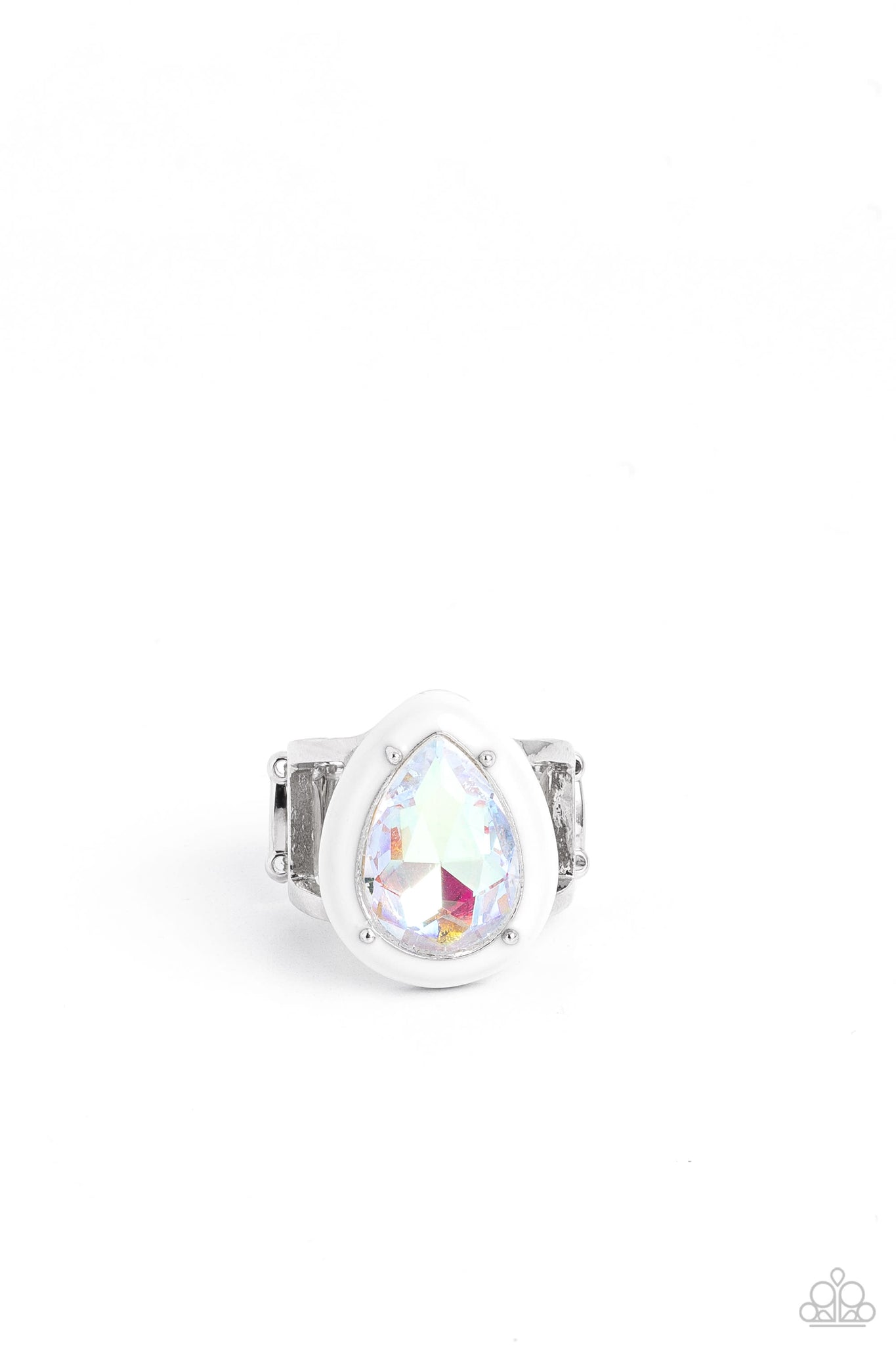 Encased in the center of a thick white teardrop frame, an iridescent teardrop is pronged in place as it shimmers and shines atop airy silver bands for a treasured statement piece atop the finger. Features a stretchy band for a flexible fit. Due to its prismatic palette, color may vary.