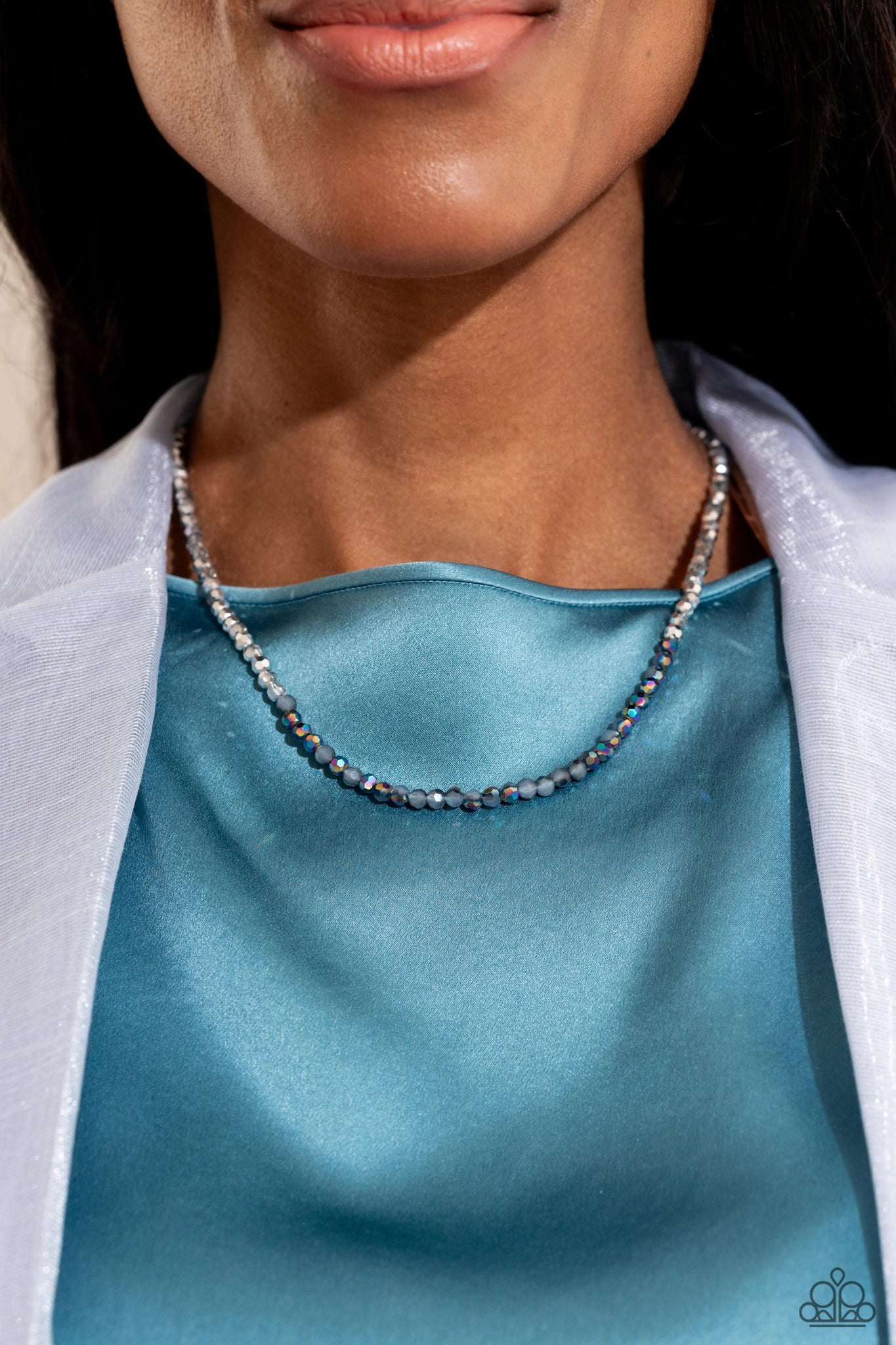 Infused along an invisible string, a faceted collection of glassy, smoky, silver, and oil spill-flecked crystal-like beads flickers and flashes below the collar for a noise-making statement. Features an adjustable clasp closure. Due to its prismatic palette, color may vary.