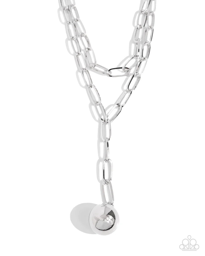 A silver paperclip chain loops around the collar while an extended silver chain with an oversized silver bead at its end cascades below the neckline for a momentous monochromatic display. Features an adjustable clasp closure.