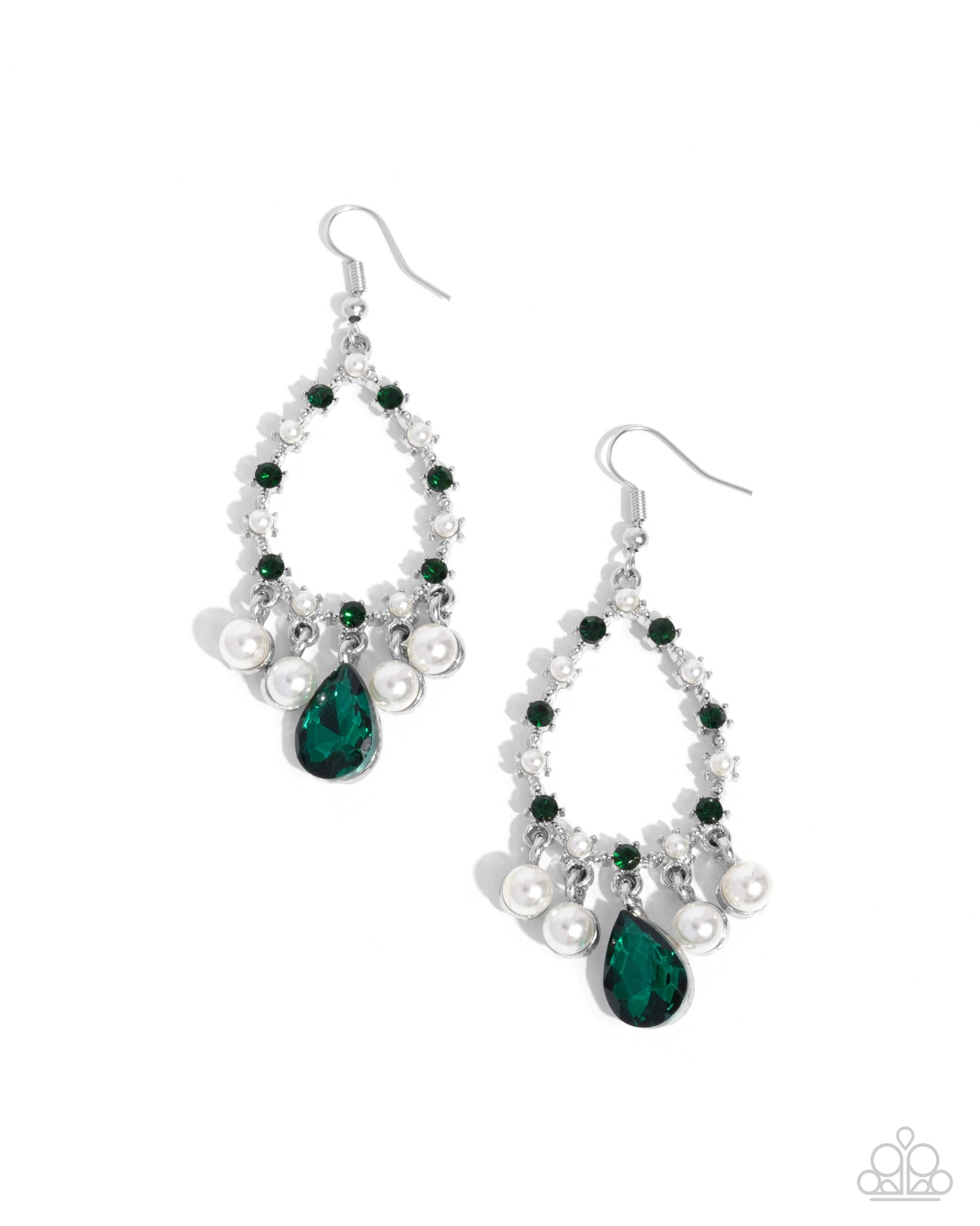 Pronged in dainty silver fittings, bubbly white pearls alternate with dainty emerald rhinestones, encrusting along a shiny silver teardrop for a glamorous look. Larger white pearls in silver fittings and a larger solitaire emerald teardrop gem sway and cascade from the bottom of the shimmery teardrop frame in tapered lengths, creating a refined fringe. Earring attaches to a standard fishhook fitting.