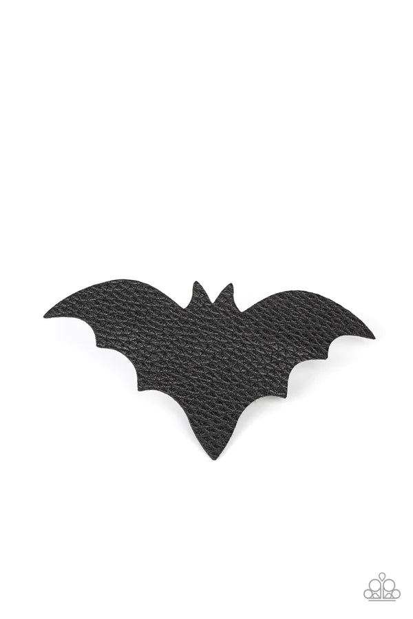 A black leather bat silhouette seemingly takes flight as it sits atop a silver clip creating an eerie illusion. Features a standard hair clip on the back.