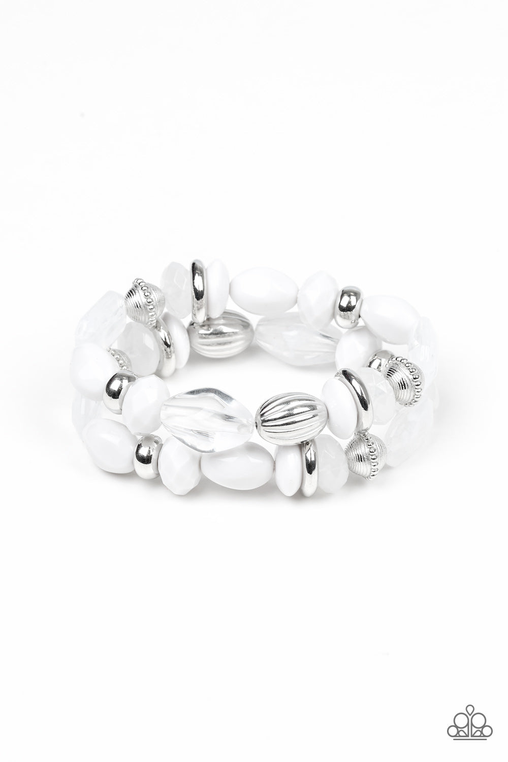An assortment of opaque, polished white, and shimmery silver beads are threaded along stretchy bands around the wrist, creating colorful layers. Featured inside The Preview at ONE Life!