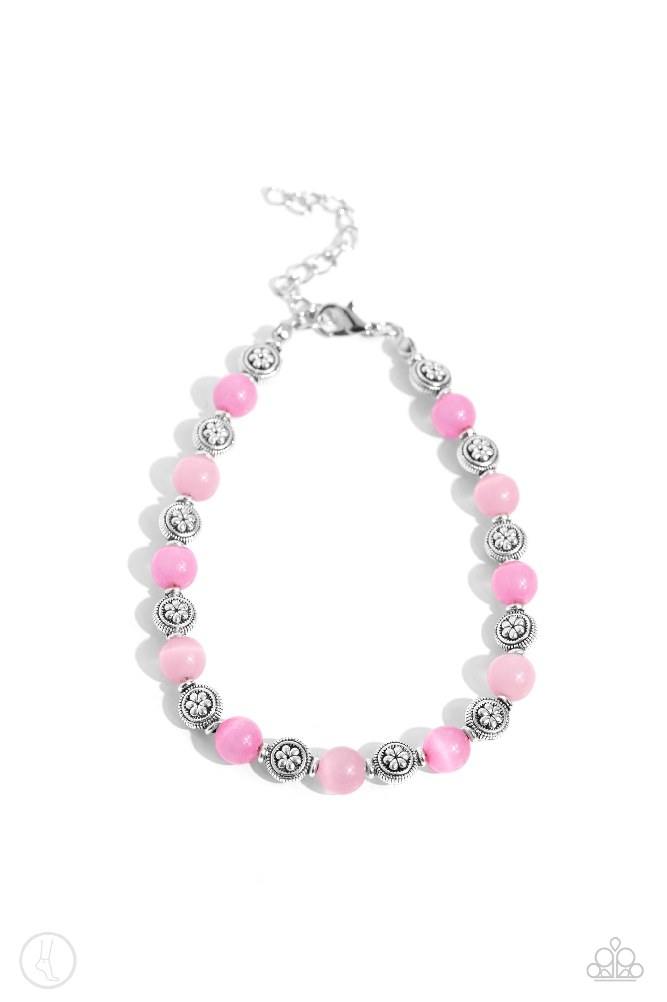 Infused along an invisible wire, a glowing collection of various pink cat's eye stones alternate with floral motif textured silver beads for a beachy statement around the ankle. Features an adjustable clasp closure.