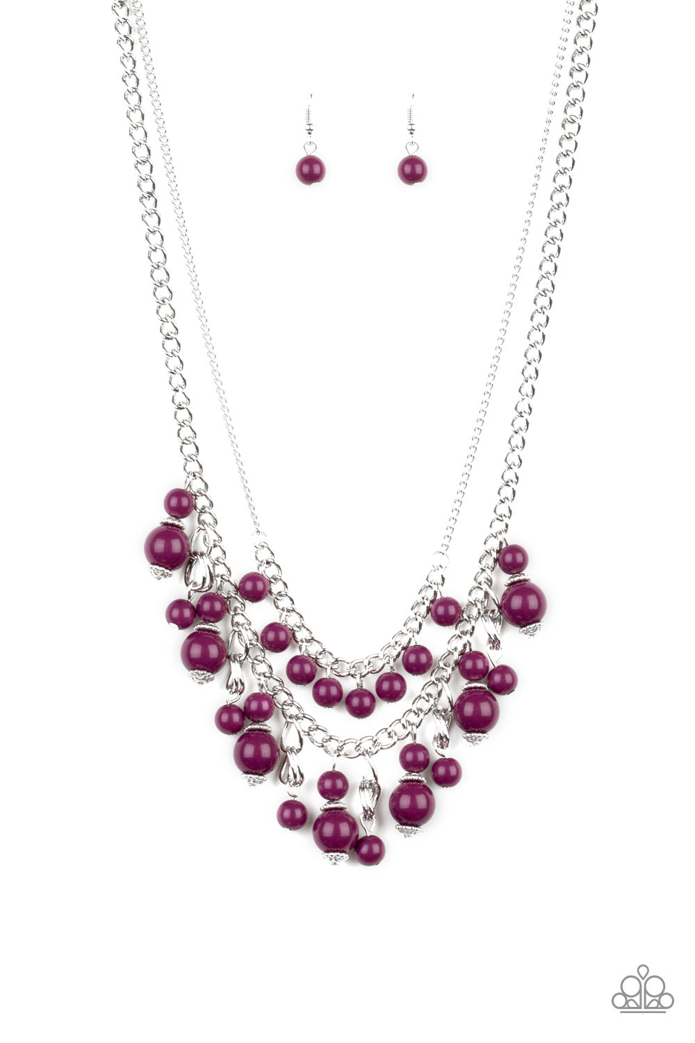 Infused with shimmery silver accents, an array of plum beads cascade from two shimmery silver chains, creating a flirtatious beaded fringe below the collar. Features an adjustable clasp closure.