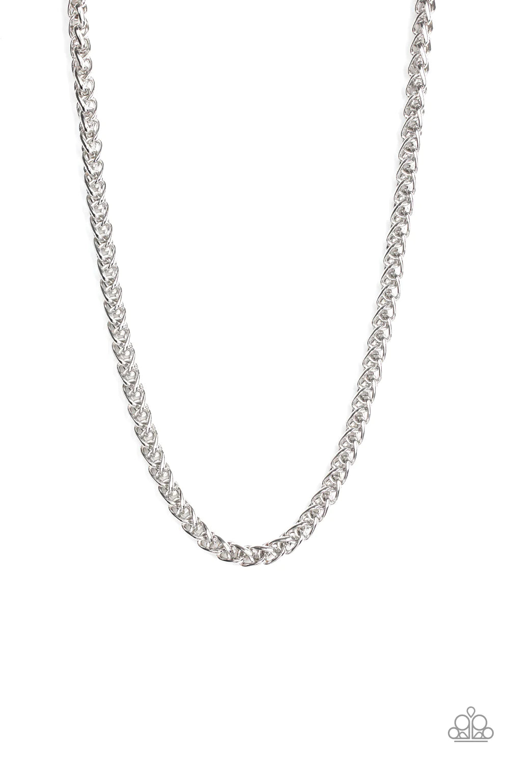 A dramatically oversized silver wheat chain drapes across the chest for a noticeable finish. Features an adjustable clasp closure.