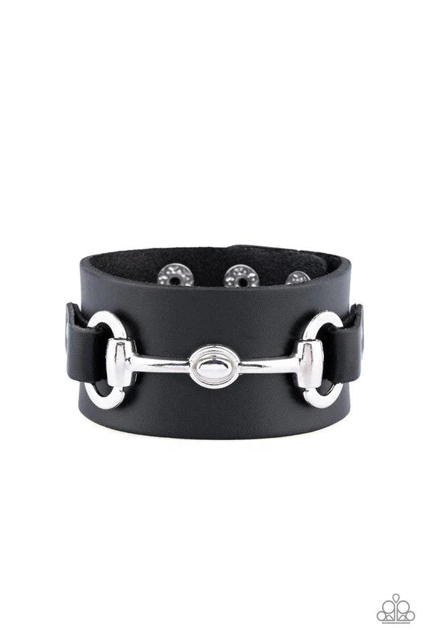 Studded in place across the front of a thick leather band, pieces of black leather loop around an abstract silver centerpiece for an urban look. Features an adjustable snap closure.