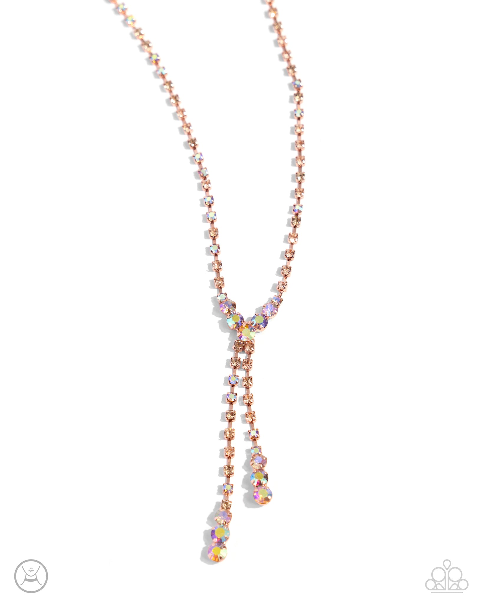 Featuring a sleek shiny copper square-fitting chain, a dainty glittery strand of peach, light-colored topaz, and iridescent-tinted light-colored topaz rhinestones stream around the collar for a refined flair. Varying in length, two strands of the same rhinestones encased in similar shiny copper square fittings stem from the bottom of the sparkly chain where bigger gems rest, creating an attention-grabbing display. Features an adjustable clasp closure. Due to its prismatic palette, color may vary.