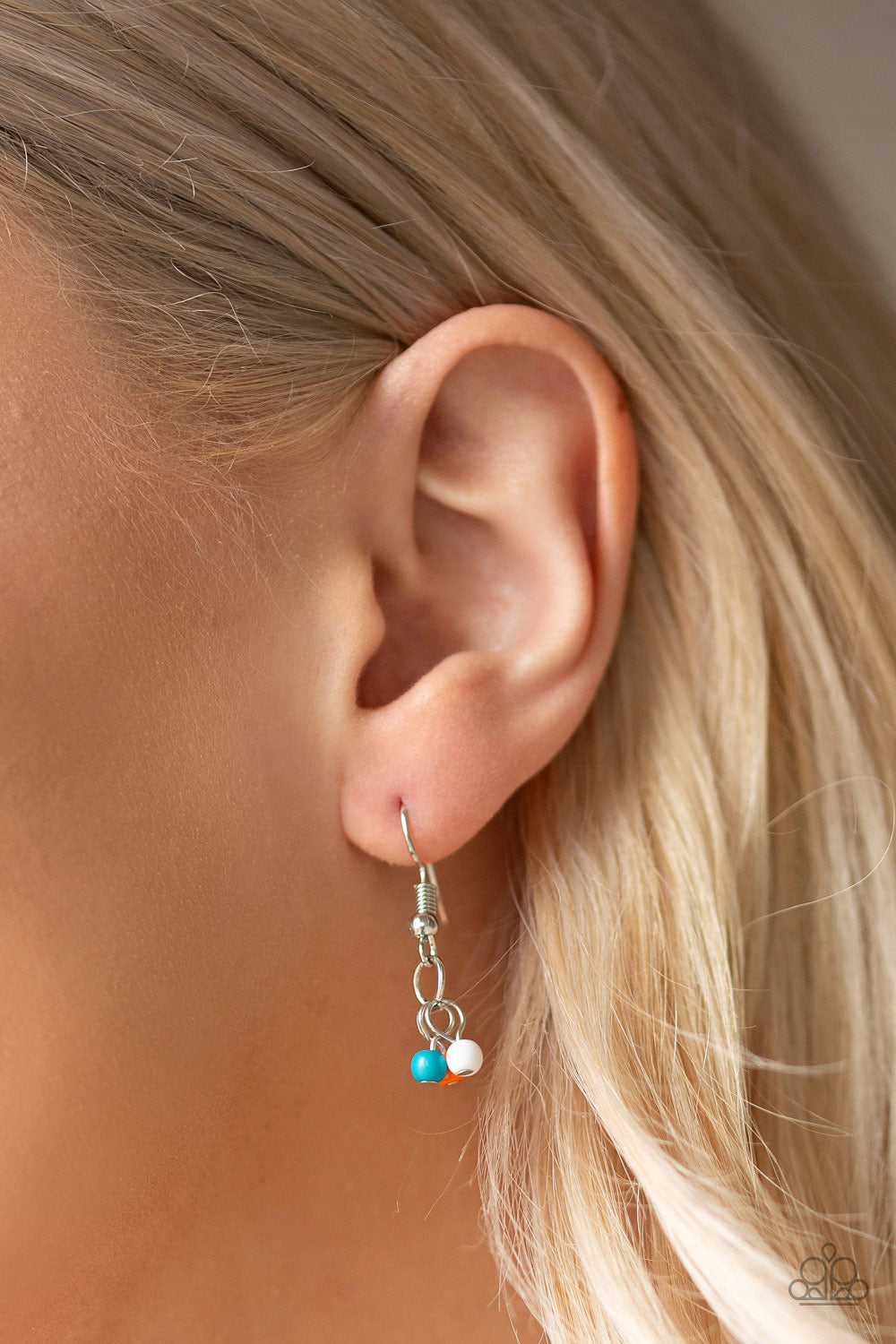 Embossed in tribal inspired patterns, silver half-moon frames link below the collar. Dainty blue, orange, and white beads swing from the bottoms of the ornate frames, creating a flirtatious fringe. Features an adjustable clasp closure.