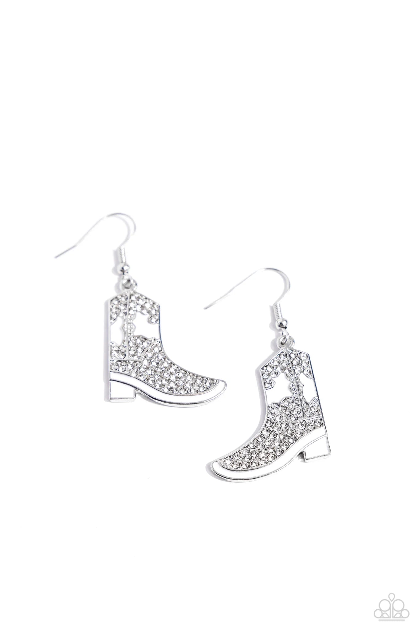 Infused with glistening white rhinestones, high-sheen silver cowboy boots cascade from the ear for a Western-inspired statement. Earring attaches to a standard fishhook fitting.