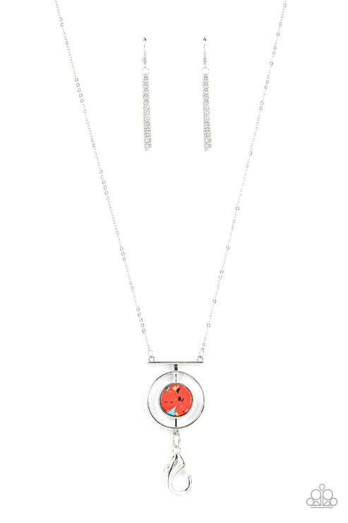 Encased in a sleek silver ring, a colorful red terrazzo stone attaches to a silver rod inside of a flat silver ring, resulting in a modern stone pendant at the bottom of an extended silver chain. A lobster clasp hangs from the bottom of the design to allow a name badge or other item to be attached. Features an adjustable clasp closure.