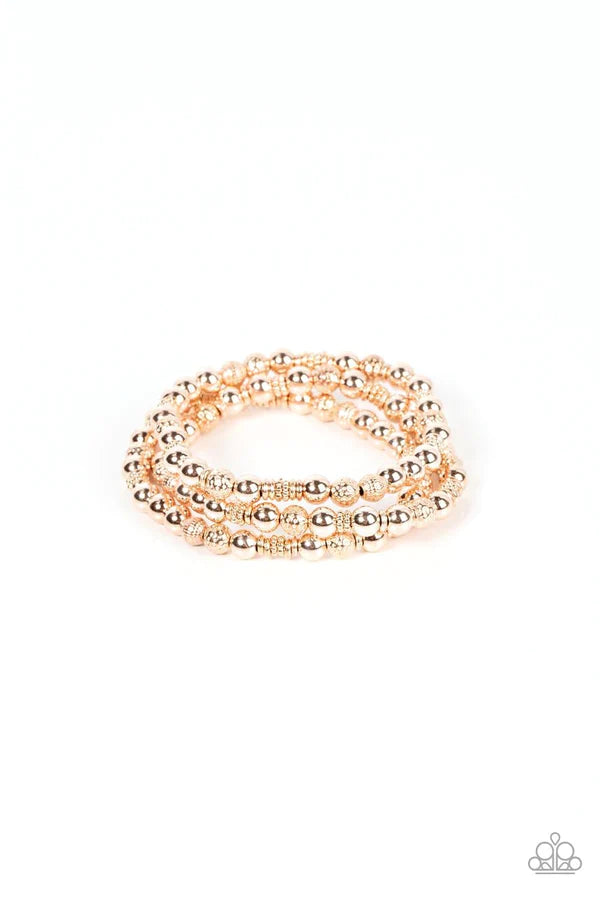 A shiny collection of smooth, studded, and textured rose gold beads are threaded along stretchy bands around the wrist, creating dainty layers.