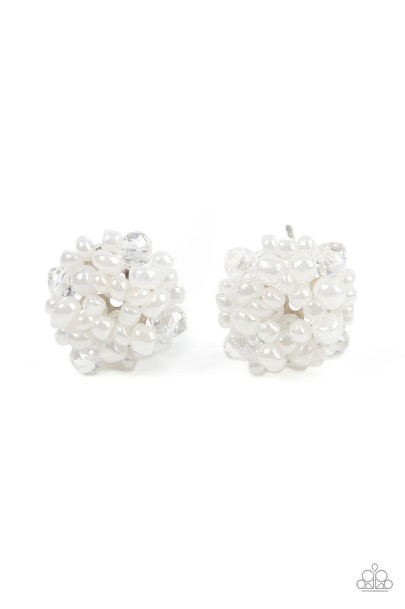 The front of a dainty silver frame is embellished in pearly white seed beads and white crystal-like accents, creating a bubbly pop of color. Earring attaches to a standard post fitting.