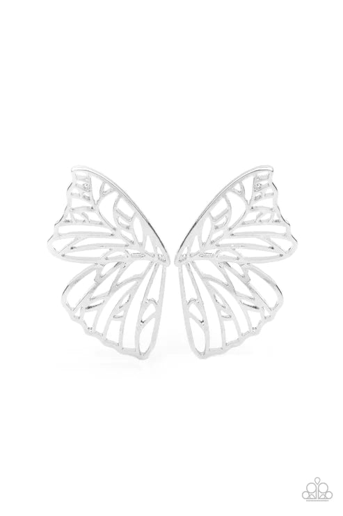 himmery silver bars delicately climb scalloped silver frames, coalescing into a whimsical butterfly wing. Earring attaches to a standard post fitting.