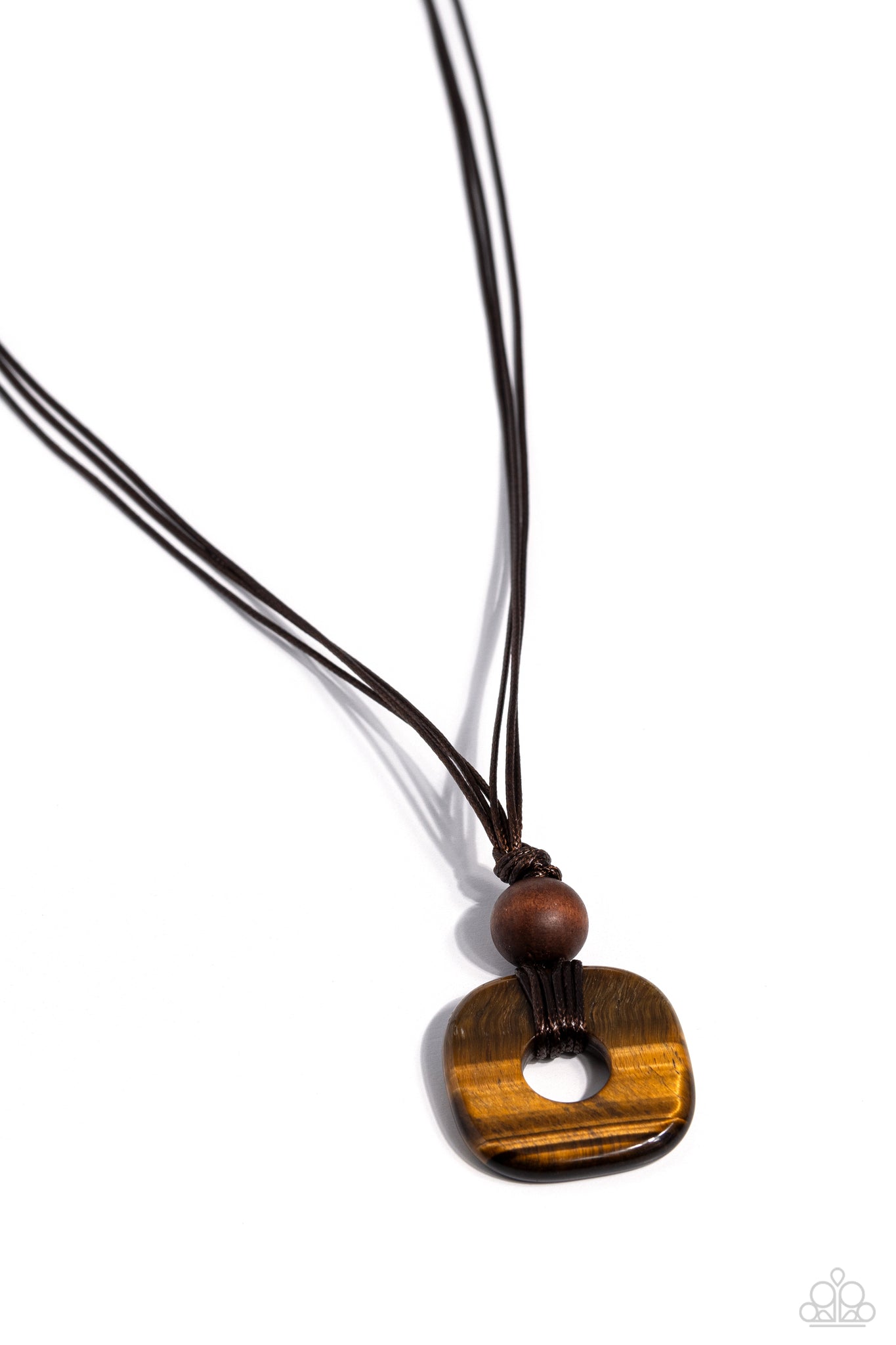 Cut into a squarish frame, a polished tiger's eye stone pendant is knotted in place below an oversized wooden bead for an earthy layered look. Features an adjustable clasp closure.
