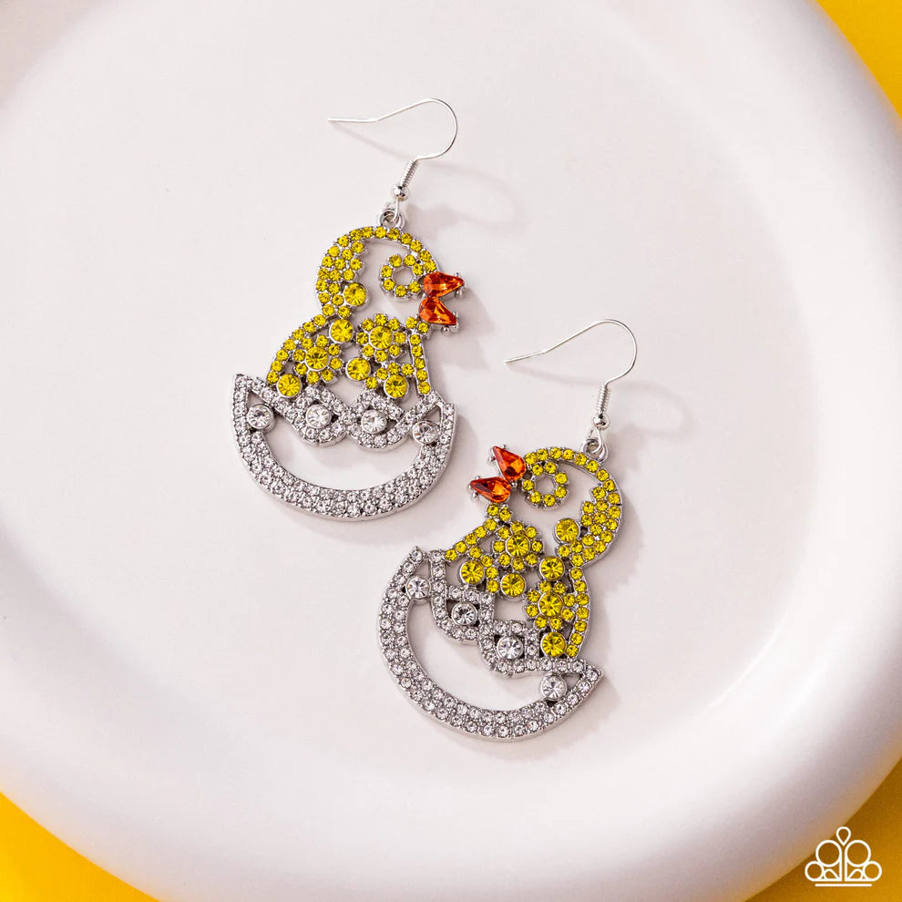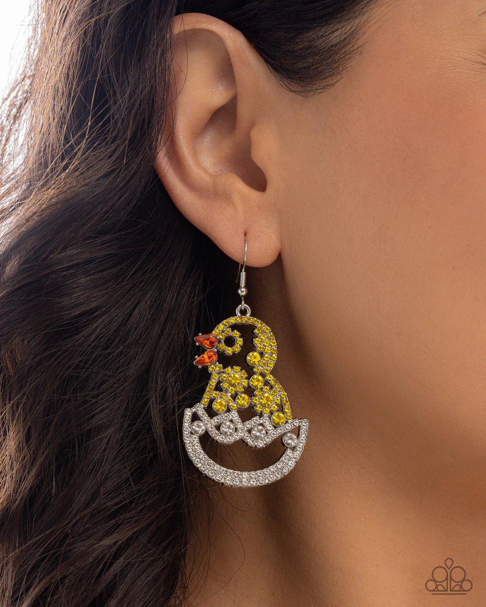 Set in a silver frame, white rhinestones are encrusted along the cracked eggshell-like frame as a yellow rhinestone encrusted chick emerges with an orange teardrop beak. Earring attaches to a standard fishhook fitting.