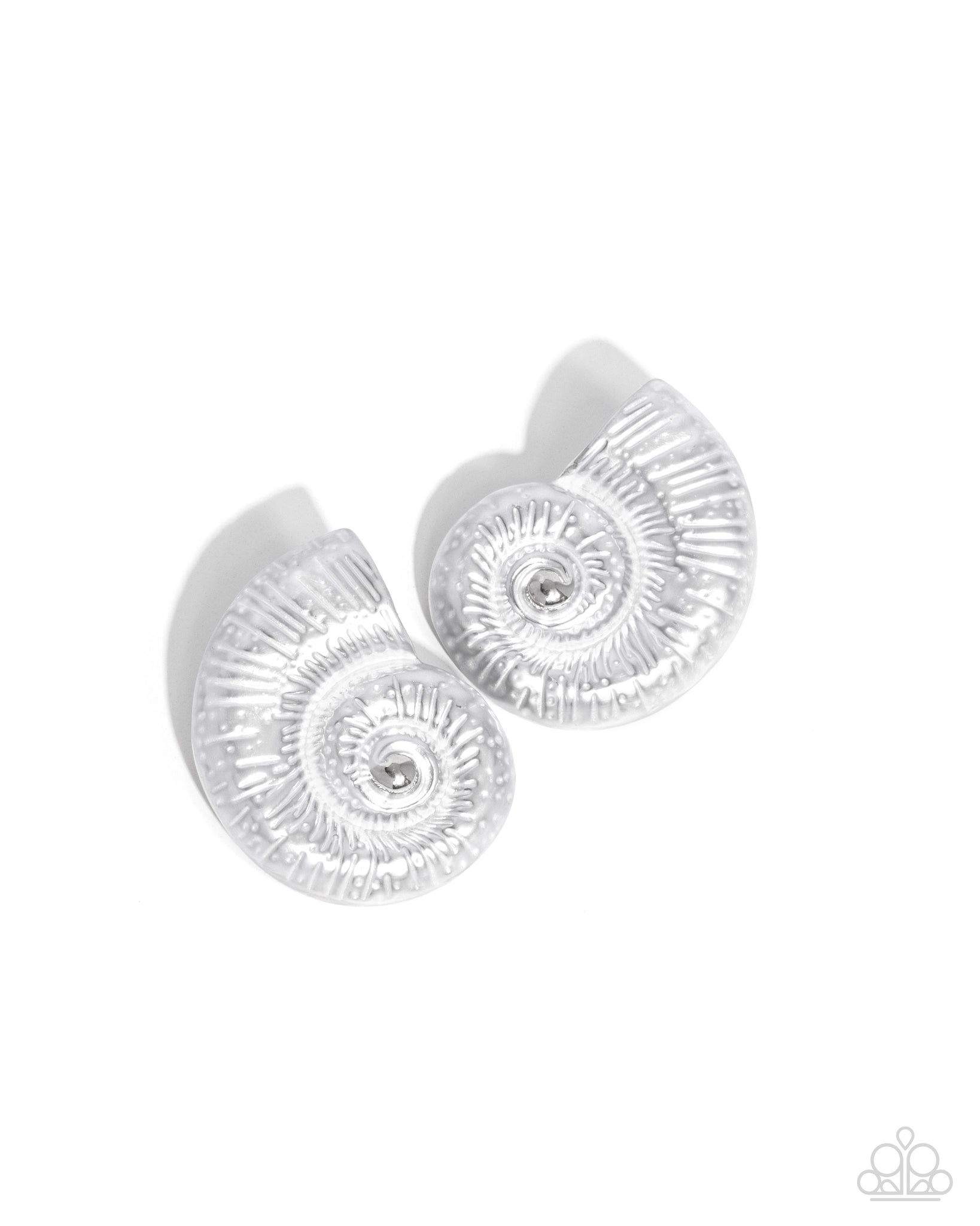 Featuring a shimmery white pearl-painted frame, a spiral seashell design hangs from the ear in a nautical-inspired design. Earring attaches to a standard post fitting.