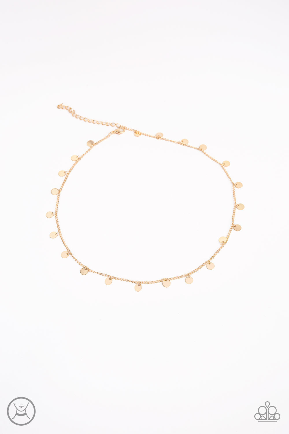 Dainty gold discs dangle from a classic gold chain around the neck, creating a playful fringe. Features an adjustable clasp closure.