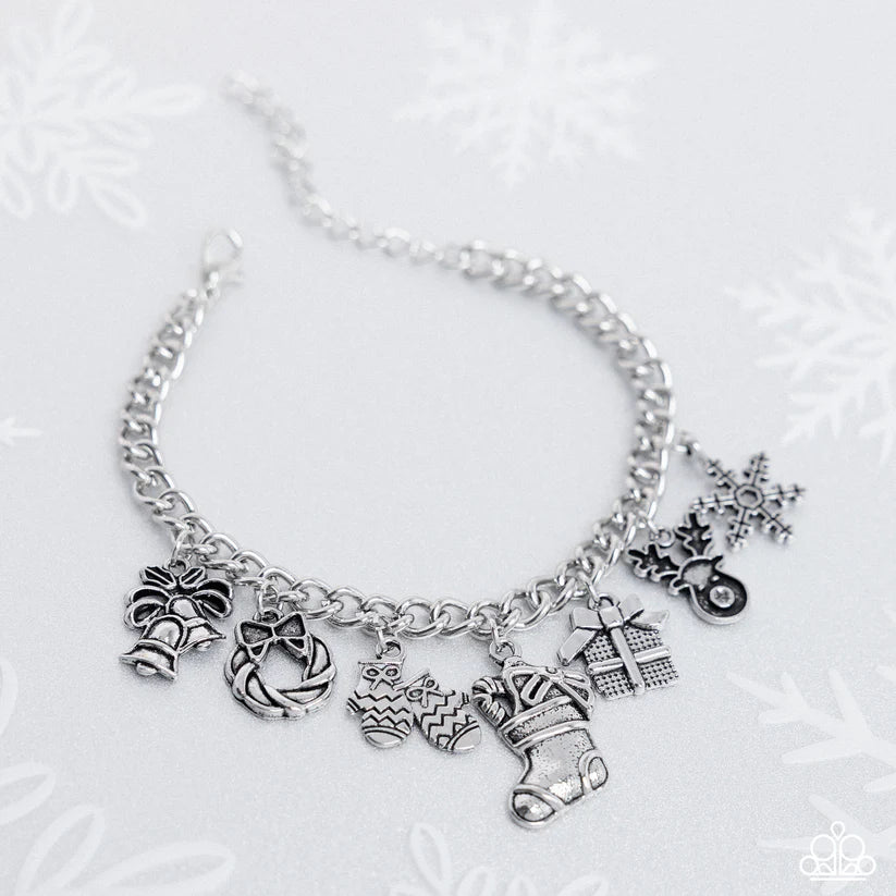 Swaying along a silver curb chain, a collection of Christmas-inspired silver charms including a pair of bells with ribbon and mistletoe leaf details, a bow-topped wreath, a pair of patterned mittens, a full stocking, a wrapped present, a reindeer, and a textured snowflake create a festive display along the wrist. Features an adjustable clasp closure.