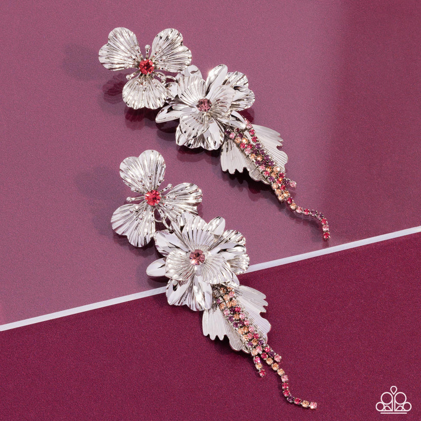 Featuring fuchsia, peach, rose, and amethyst rhinestone centers, abstract, three-dimensional layered silver flowers with crimped and sleek textures cascade from the ear. A solitaire crimped silver petal blooms below the dual floral centerpieces for additional texture while strands of pink multicolored rhinestones in silver square fittings give way and taper even further along the ear, creating a whimsically, shimmery shoulder-dusting display. Earring attaches to a standard post fitting.
