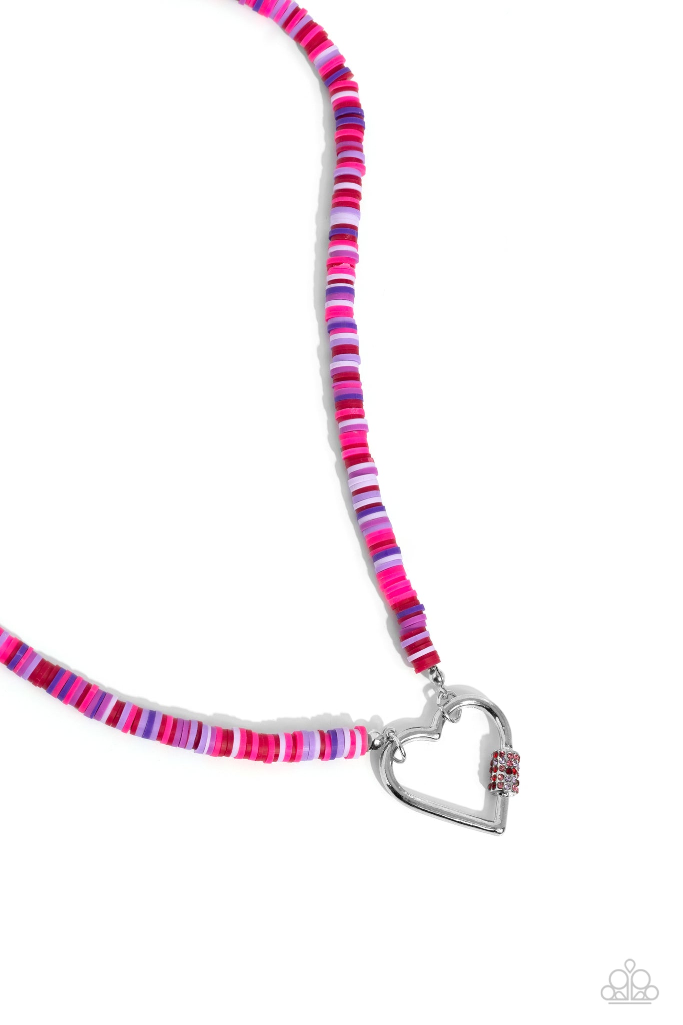 Infused along an invisible string, a collection of various pink, red, and purple clay discs coalesce around the collar for a vivacious display. Featuring a purple, pink, and red rhinestone-encrusted carabiner accent, a silver heart frame connects to the bottom of the multicolored strand for a romantic finish. Features an adjustable clasp closure.