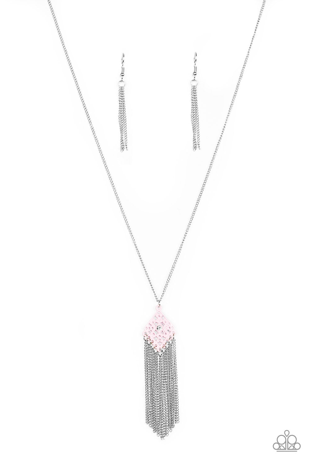 A dainty white rhinestone is pressed into the center of a pink kite-shaped pendant. Featuring a filigree filled center, the colorful pendant gives way to a whimsical chain tassel for a flirty finish. Features an adjustable clasp closure.