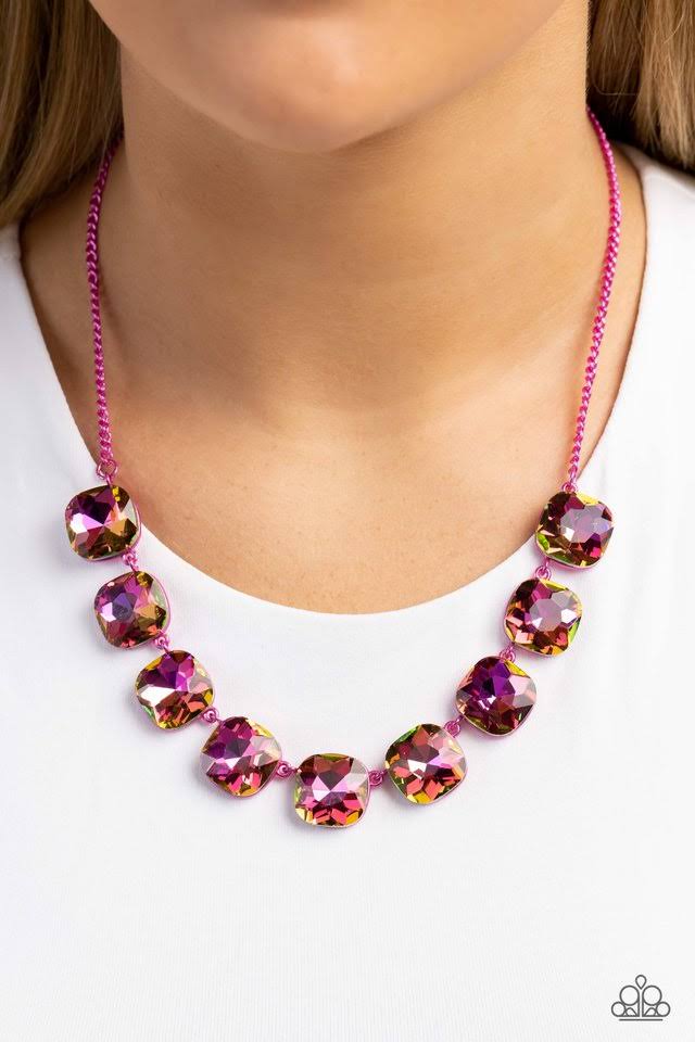 Featuring a vivacious pink chain, a collection of pink UV shimmery cushion-cut gems, pressed in vibrant pink frames, coalesces around the collar to create a playful pop of color. Features an adjustable clasp closure.