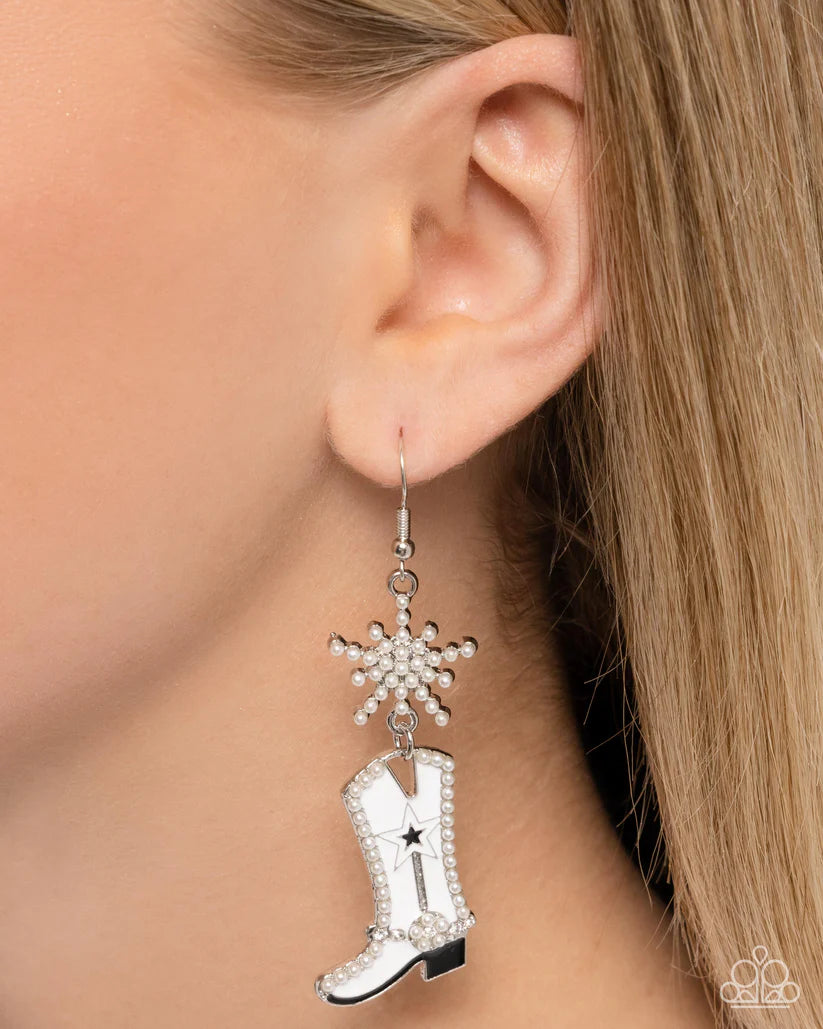 Embellished in dainty white pearls an explosive silver star gives way to a white-painted cowboy boot. Lined with black-painted details, white rhinestones, and similar dainty white pearls, the cowboy boot kicks below the ear for a Western whimsical look. Earring attaches to a standard fishhook fitting.