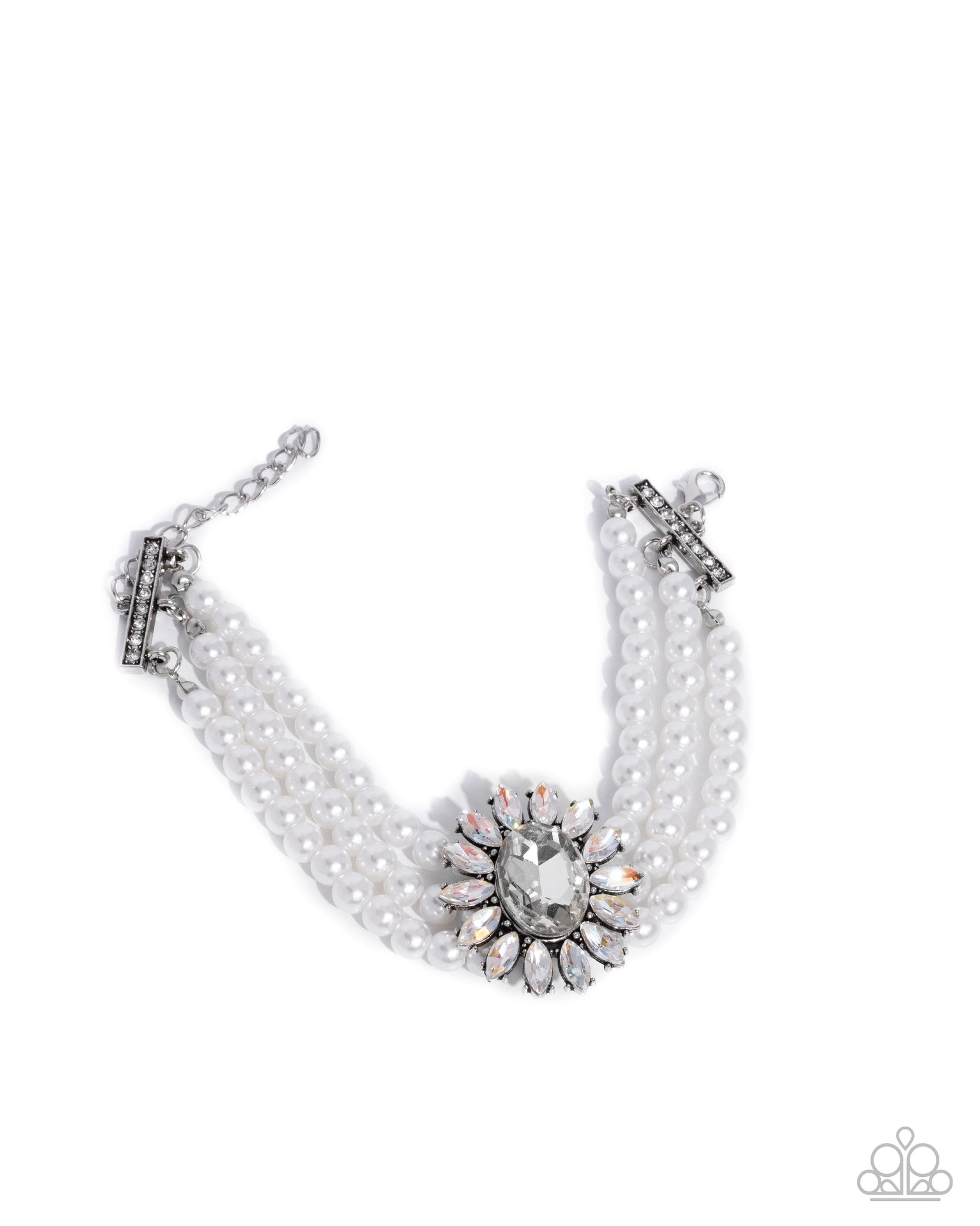 Pronged in silver fittings, an elegant explosion of marquise-cut UV shimmery gem petals encircles a white oval gem delicately coalescing into a floral centerpiece. The refined ornament delicately holds together strands of glossy pearls that attach to silver horizontal fittings, creating romantically regal layers around the wrist. Features an adjustable clasp closure.