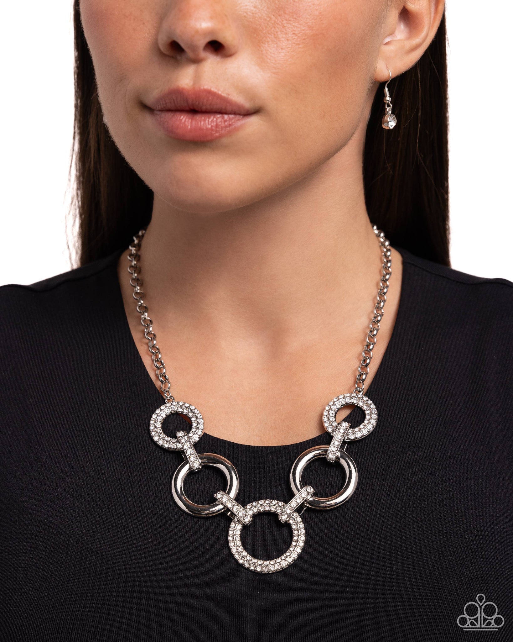 Encrusted in blinding white rhinestones, a collection of silver rings alternate with simple silver rings, connected through white rhinestone-encrusted clasps from a classic silver chain for a classy cosmopolitan look. Features an adjustable clasp closure.