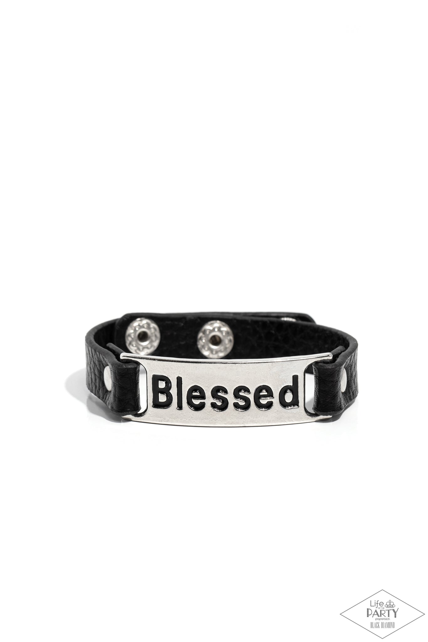 Stamped in the word, "Blessed" a shiny silver plate is studded in place along a dainty black leather band for a whimsical look. Features an adjustable snap closure.