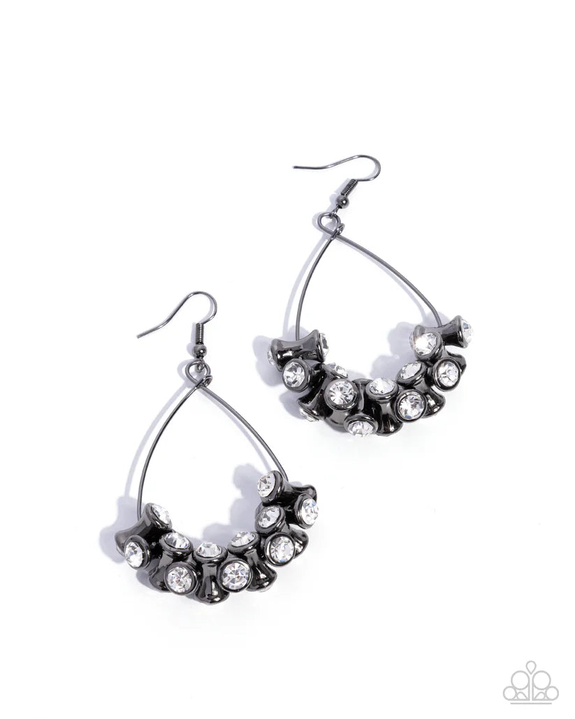 Hourglass-inspired gunmetal fittings, capped on both ends with faceted white rhinestones, are infused and twist along the bottom curve of a gunmetal teardrop wire hoop, resulting in an industrial bold fringe. Earring attaches to a standard fishhook fitting.