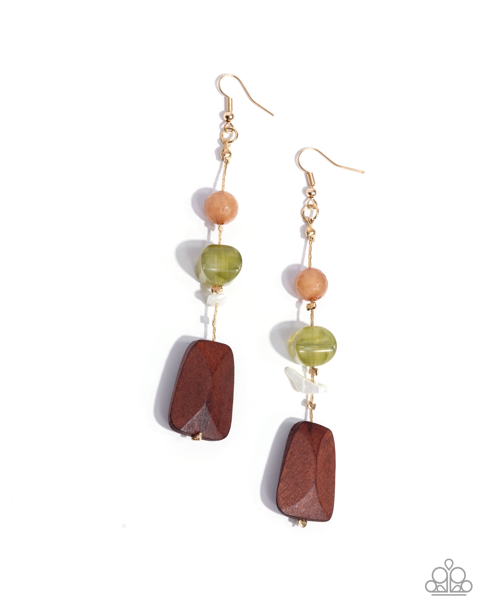 A gold stud, a faceted brown round bead, an abstract square green bead, a chiseled white stone, an abstract brown wooden bead, and gold accents link in a free-spirited pattern down the ear, for a creatively chic lure. Earring attaches to a standard fishhook fitting. As the stone elements in this piece are natural, some color variation is normal.