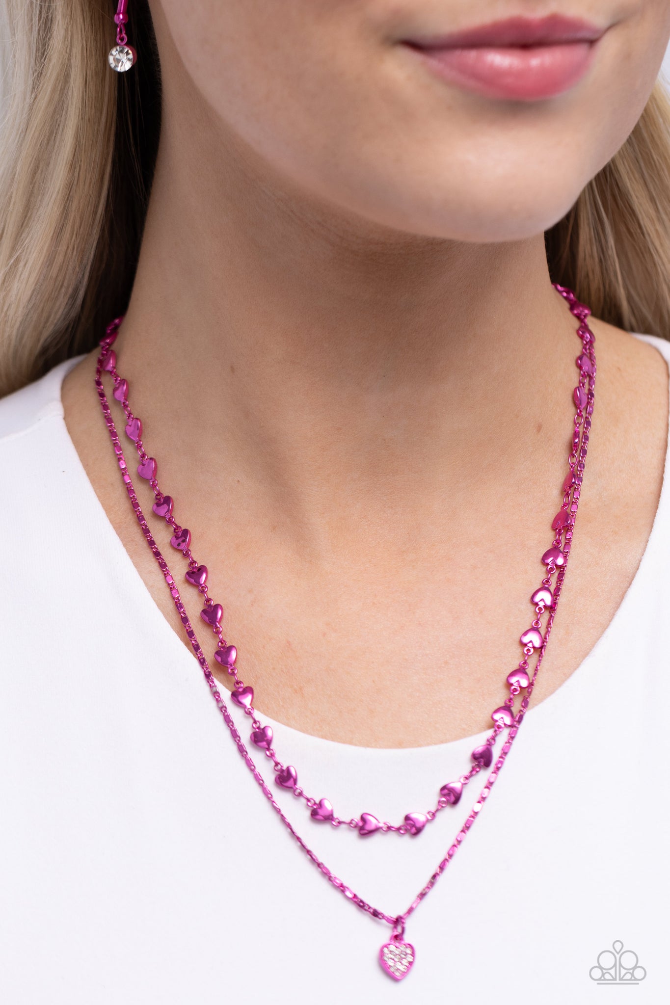 Cascading from a fuchsia chain, a white rhinestone-encrusted heart pendant rests below the collar for a heartfelt display. A gleaming fuchsia heart-infused chain layers atop the solitaire pendant for a romantic finish. Features an adjustable clasp closure.