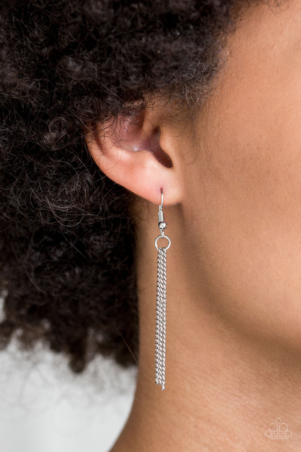 An oversized white gem swings from the bottom of a lengthened silver chain for a dramatic look. A lobster clasp hangs from the bottom of the design to allow a name badge or other item to be attached. Features an adjustable clasp closure.