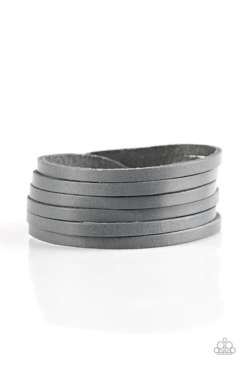 A gray leather band is spliced into various strands and wrapped around the wrist for a seasonal look. Features an adjustable snap closure. Sold as one individual bracelet.