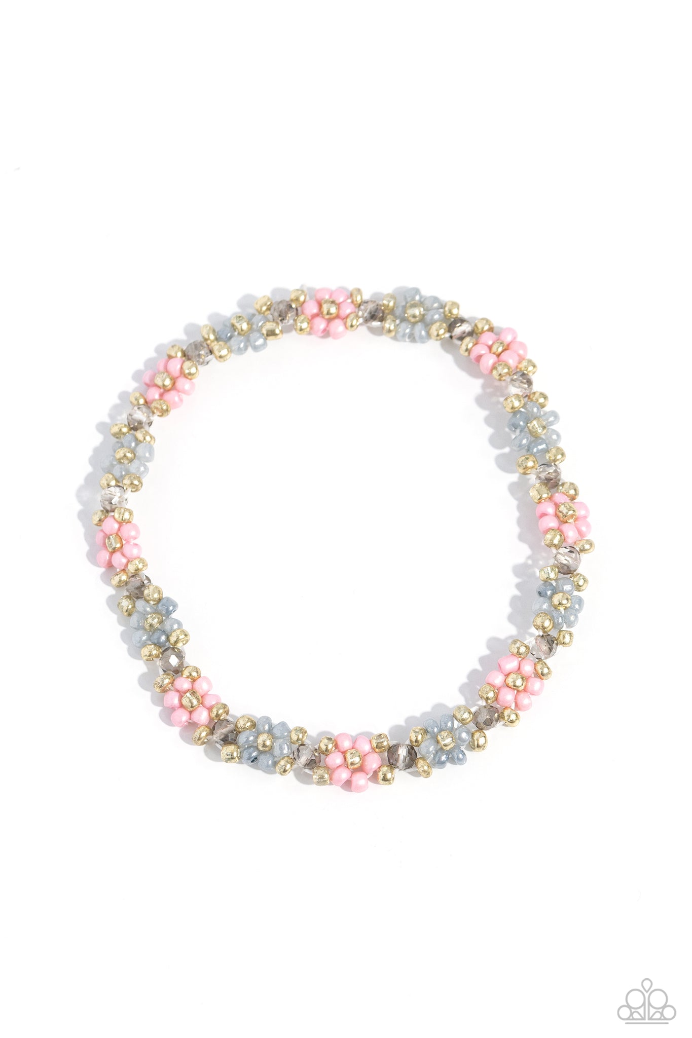 Infused along an elastic stretchy band, a collection of light pink and gray seed bead flowers with gold seed bead centers delicately braid around the wrist. Additional gold seed beads and dainty reflective smoky bead accents are interspersed throughout the strand for a whimsical finish.