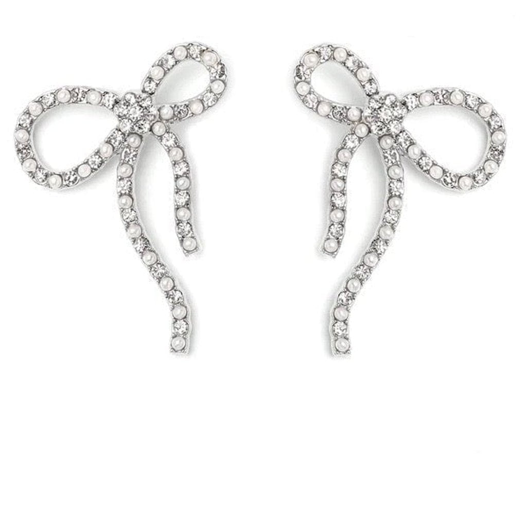 Adorned in sparkling white rhinestones and dainty white pearls, a high-sheen band of silver curls and loops into a stunning bow, creating a charming lure. Featured in the center of the classy design, a dainty white rhinestone flower adds a floral finish to the stunning display. Earring attaches to a standard post fitting.