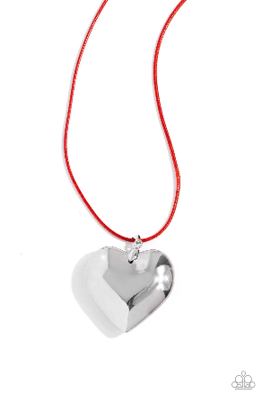 An oversized, sleek silver heart glides along a vibrant red cord, creating a flirtatious pendant below the collar. Features an adjustable clasp closure.