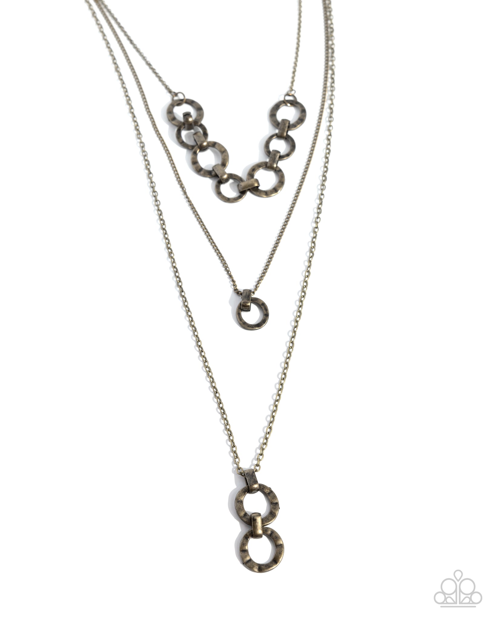 A collection of hammered antiqued brass rings in varying sizes interconnect and layer below the collar in three dainty brass tiers for a dauntless finish. Features an adjustable clasp closure.