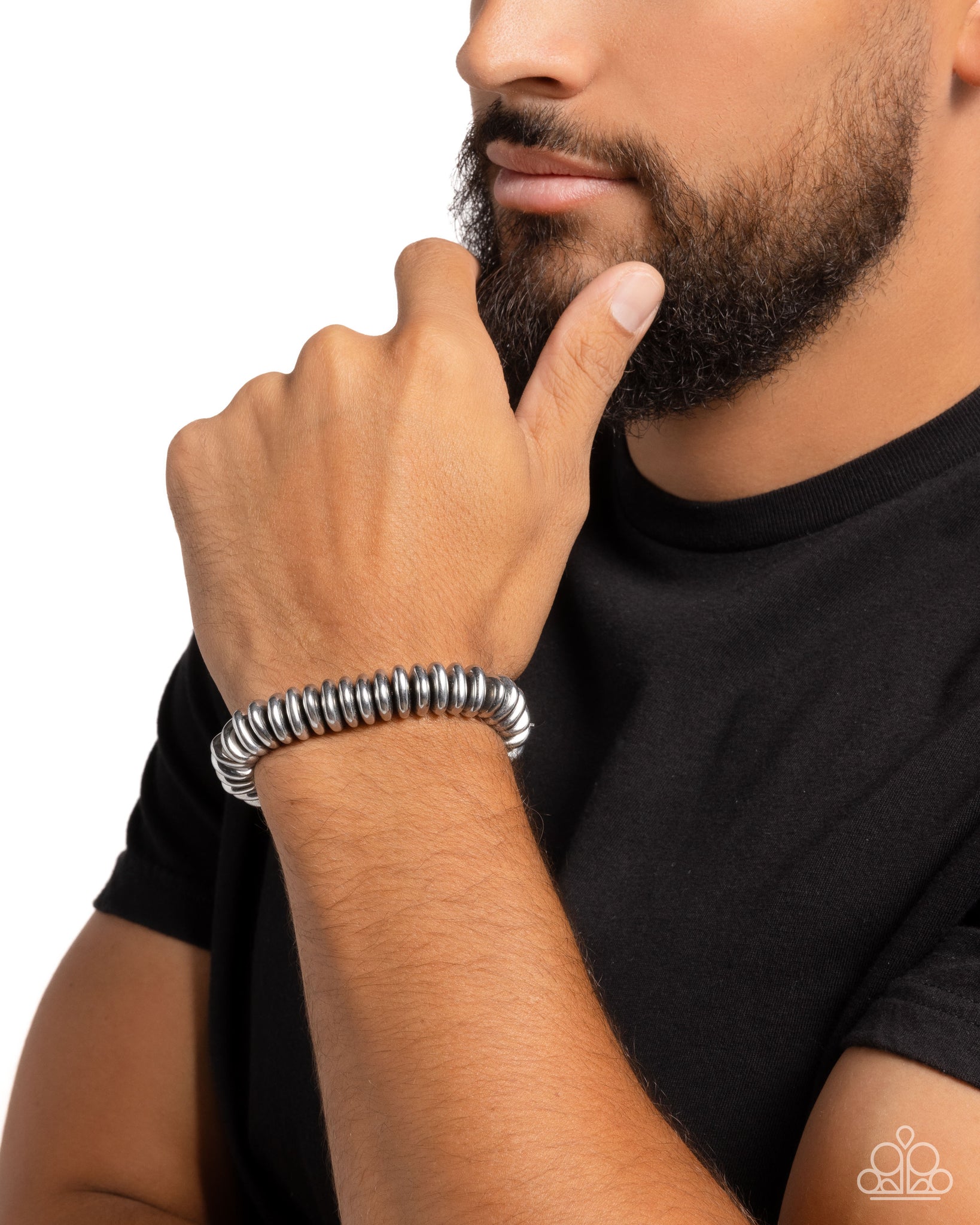Infused along an elastic stretchy band, a collection of silver sleek discs shimmer and shine along the wrist for a dynamic display of dominant color.